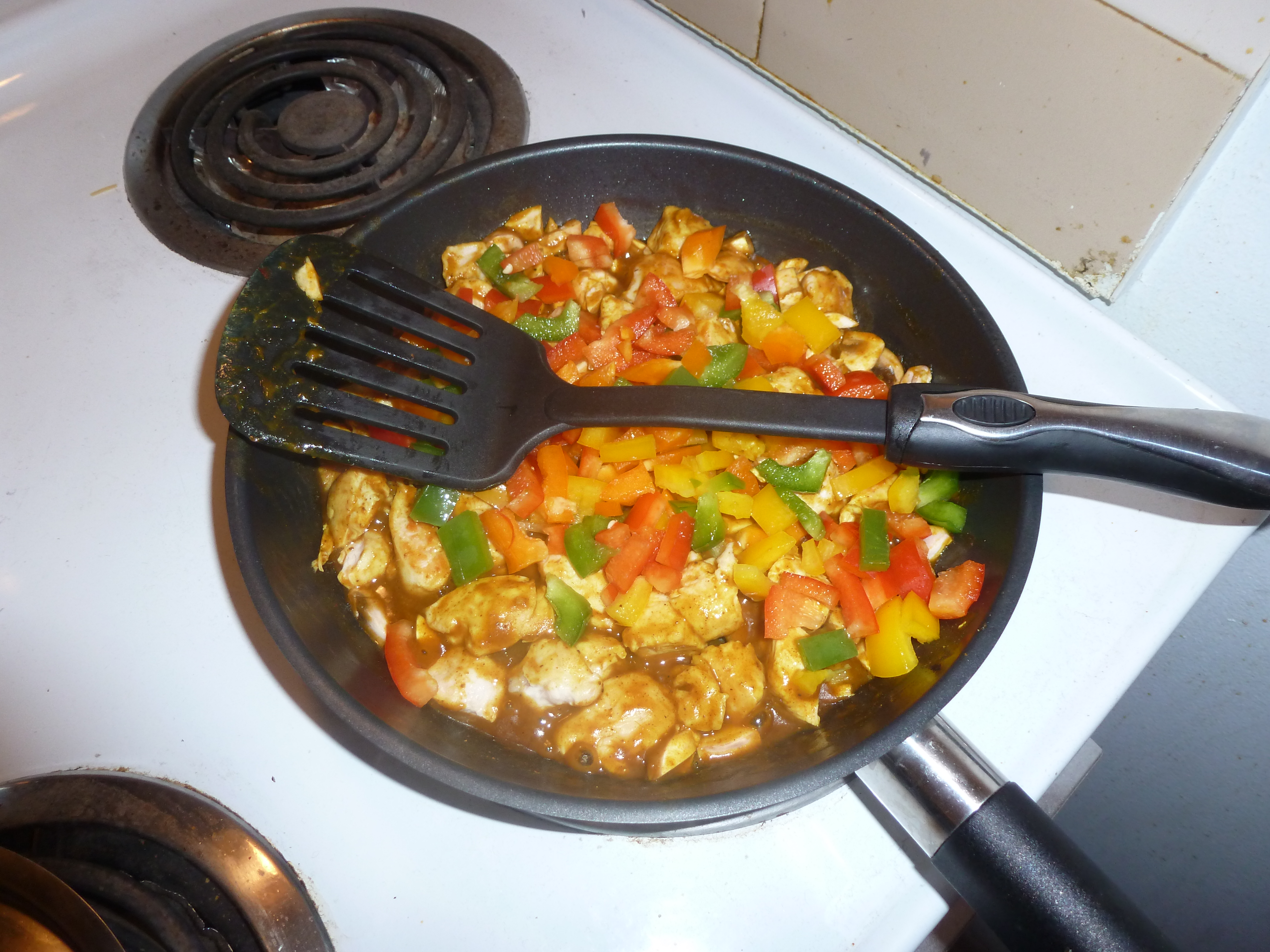 There were some guidelines in the sauce bottle so I picked up some chicken breasts, and one of this already-cut pieces of assorted peppers they sell at the grocery story. I’m lazy. Sue me. I didn’t forget to get mushrooms as well. I heated up a frying pan, and sent in the chicken. Waited until it was brown all over and send the sauce while I diced the peppers and mushrooms into even smaller bits.