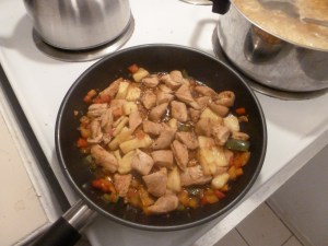 Presto, chicken and pineapple teriyaki. Things learned? More pineapple and more chili next time. I also think a sauce would’ve helped the pasta.