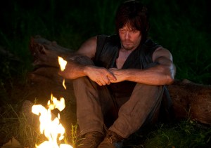 The guys he helps (or more precisely tries to help) will be the same ones that Daryl will have to kill once they turn. That means Tyreese was actually first to be there. Meanwhile, two walkers approach Mika, who’s back to back with her sister. She calls out to Lizzie but she’s in a trance(and possibly about to suffocate Judith). Mika shoots. Tyreese hears it, but he’s still busy. Right as he finishes the last walker he turns to find Carol. The last surviving guy from the walker attack tells them to follow the tracks to a safe place. He’s been bitten and he’s left there to turn with his friend. They’ll meet Daryl later.