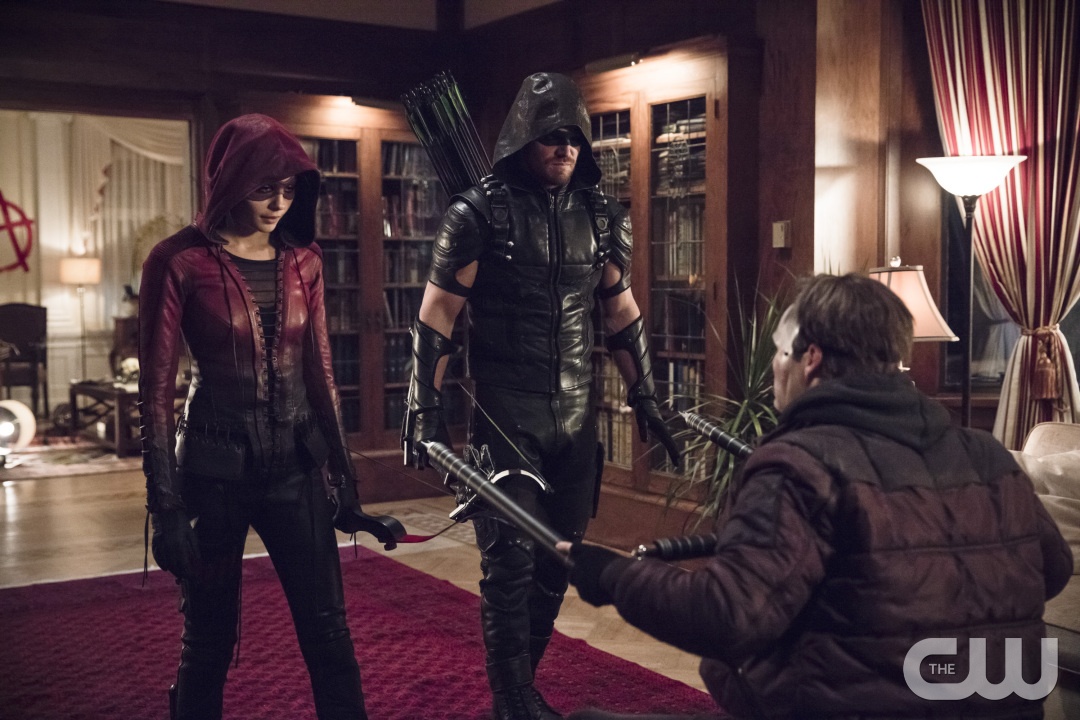 Arrow — “Blood Debts” — Image AR410a_0081b.jpg — Pictured (L-R): Willa Holland as Speedy, Stephen Amell as The Arrow and Alexander Calvert as Anarky — Photo: Katie Yu/ The CW — é 2015 The CW Network, LLC. All Rights Reserved.