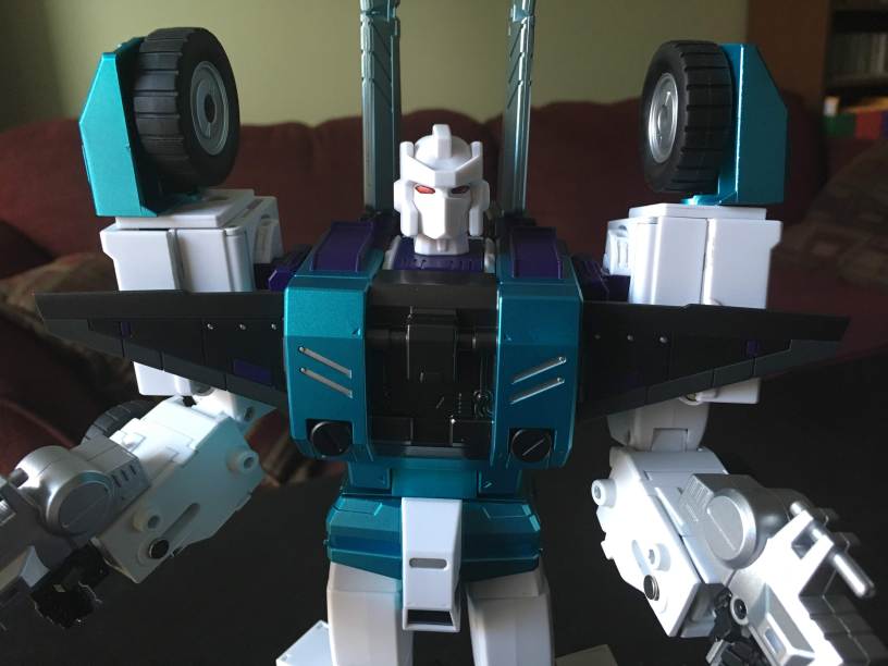 The “starfighter” jet mode is a Sixshot classic and I have to say that Hydra pulls it off much better than GCreation’s GDW-03 Fuuma simply because it keeps the concussion blaster rifles on the wings. That being said, Fuuma’s chest wings look better due to the more pulled back angle. Hydra’s chest wings finish straight which kinda annoys me because they don’t look as cool in pictures. Hydra’s chest wings look a little too simple without any decals. I wish Hydra’s chest wings would be angled slightly backwards. The actual jet wings do look better on Hydra with the metallic silver finish. The wings can also bend on Hydra, which is not something I thought I wanted but at least that way he fits inside my shelf furniture.