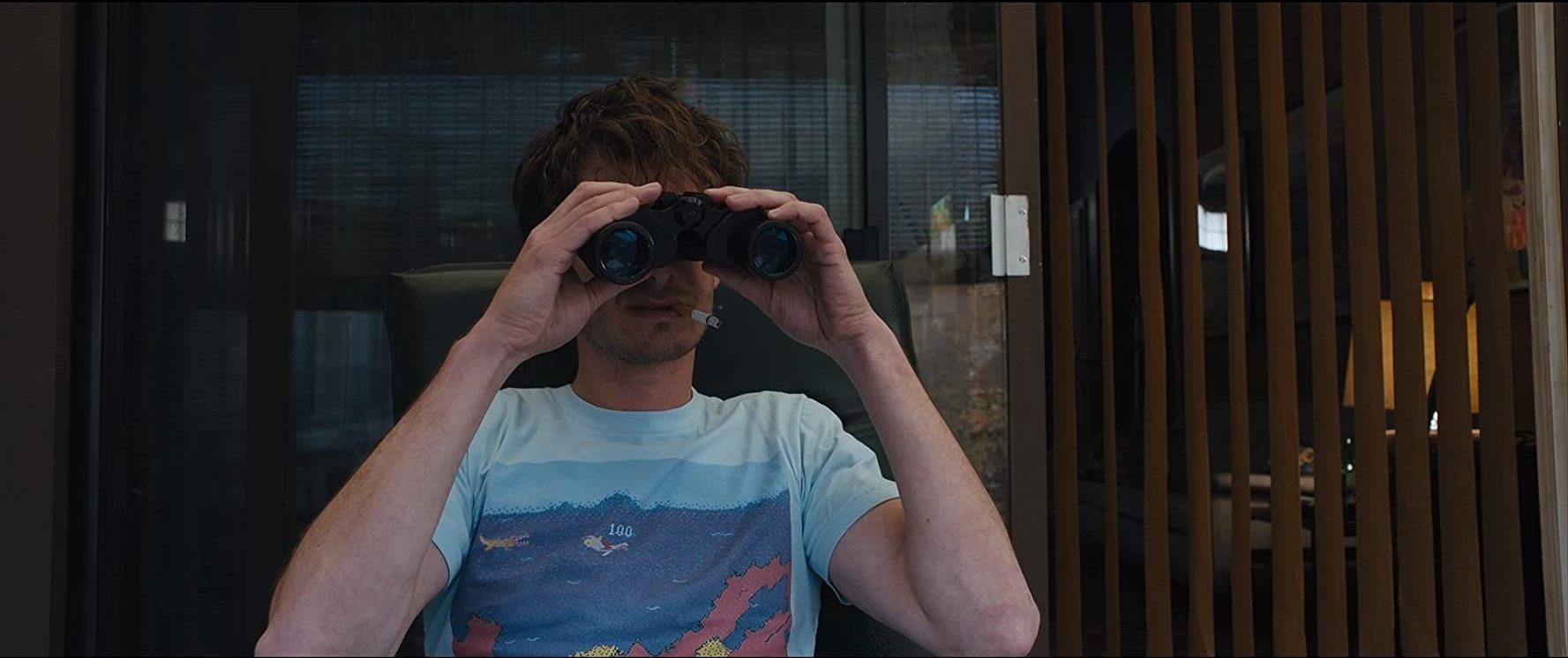Sam is not a detective. He reads a local independent hand-drawn zine called “Under the Silver Lake” that talks about the mysterious dog killer that has been murdering people’s pets around the neighborhood. He chases after another girl that collects a box from Sarah’s apartment and walks into random Hollywood parties. Sometimes he runs into Allen (Jimmi Simpson) who also frequents the party scene and tells him about the girls he’s following. Other times he joins a bar buddy (Topher Grace) while he’s peeking into women’s windows using a camera-equipped drone.