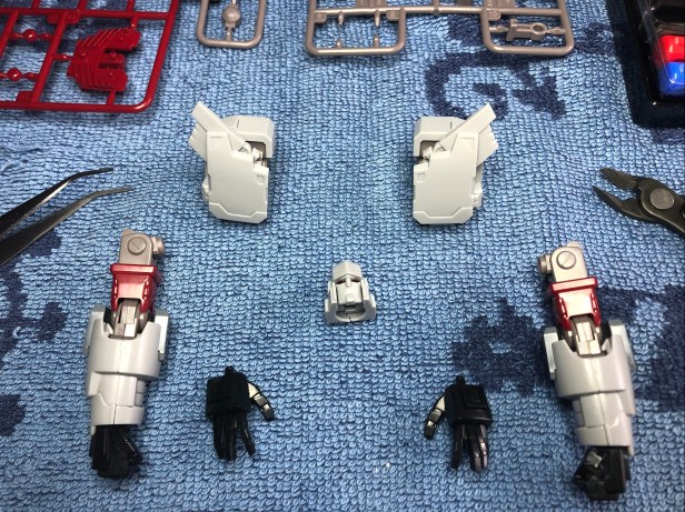Please make sure you only take your next piece nipped out of the runner one side at a time. You don’t want to start guessing which one was which number. Those red buttons on the skirt sections of his waist should go in one at a time and click as you push them in, otherwise you’re doing something wrong. There are holes on the other side to those to hook up to the rest of his skirt, so don’t put the red buttons backwards or you’ll have to fish them out. Fortunately I had a decent starter tool kit.