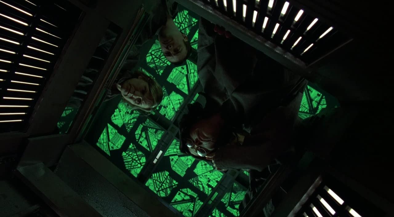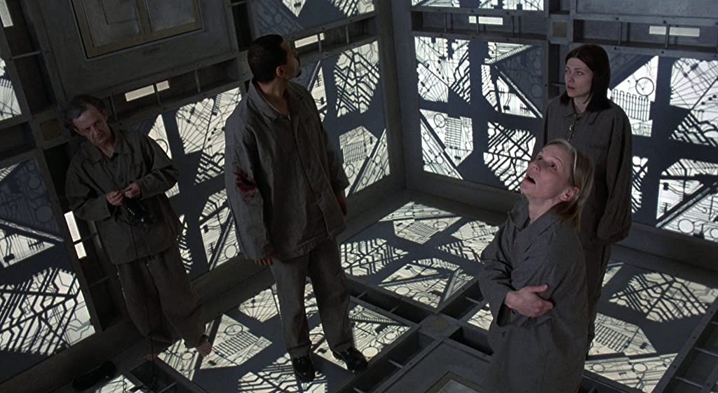 Cube (1997) was directed by Vincenzo Natali who co-wrote it with Andre Bijelic and Graeme Manson. Six people are stuck inside a cube-shaped room with hatch-like doors that lead to other cubes on each surface. Some of the cubes have deadly traps. Figuring out which direction is safe is a matter of life and death. We learn this first when meeting one lone prisoner name Alderson (Julian Richings) for what ends up being a very brief moment.