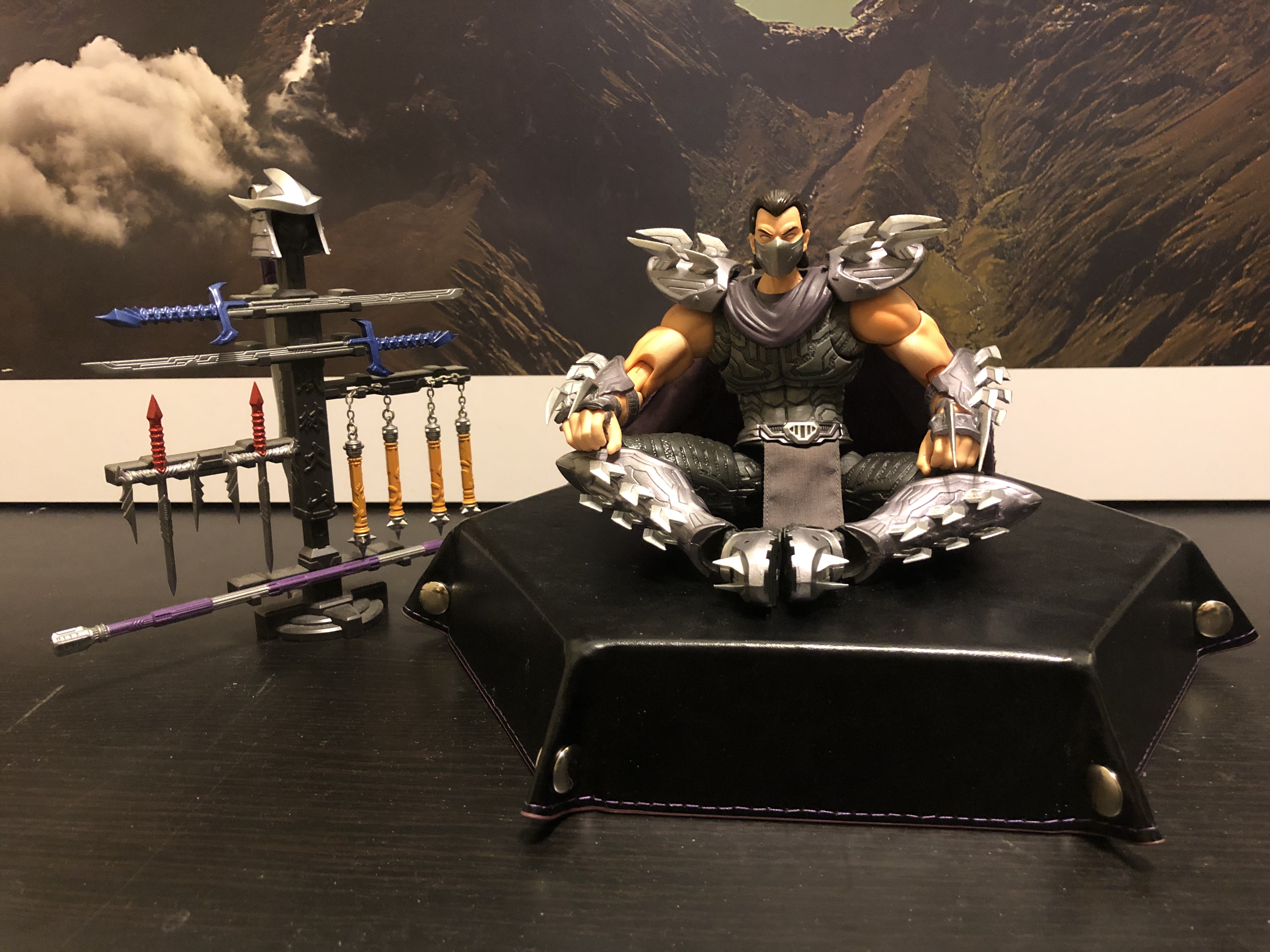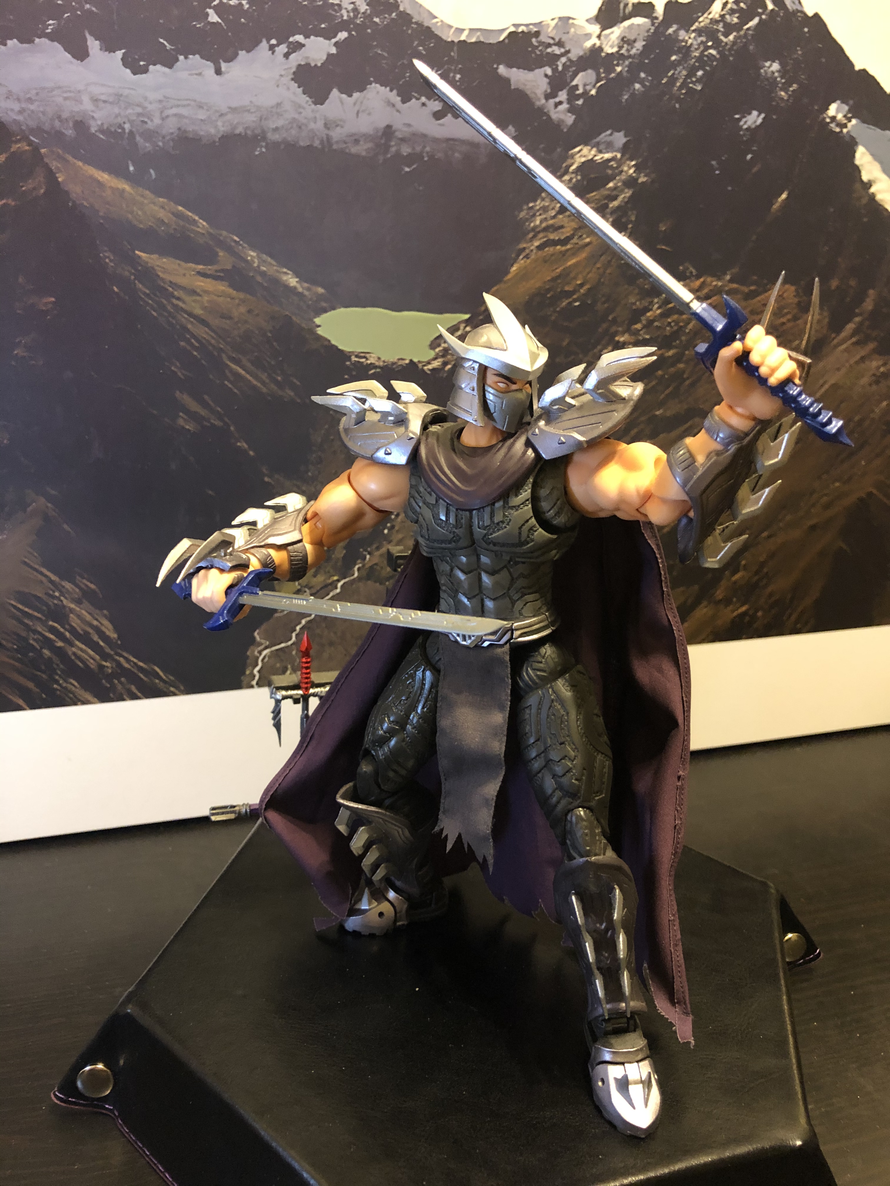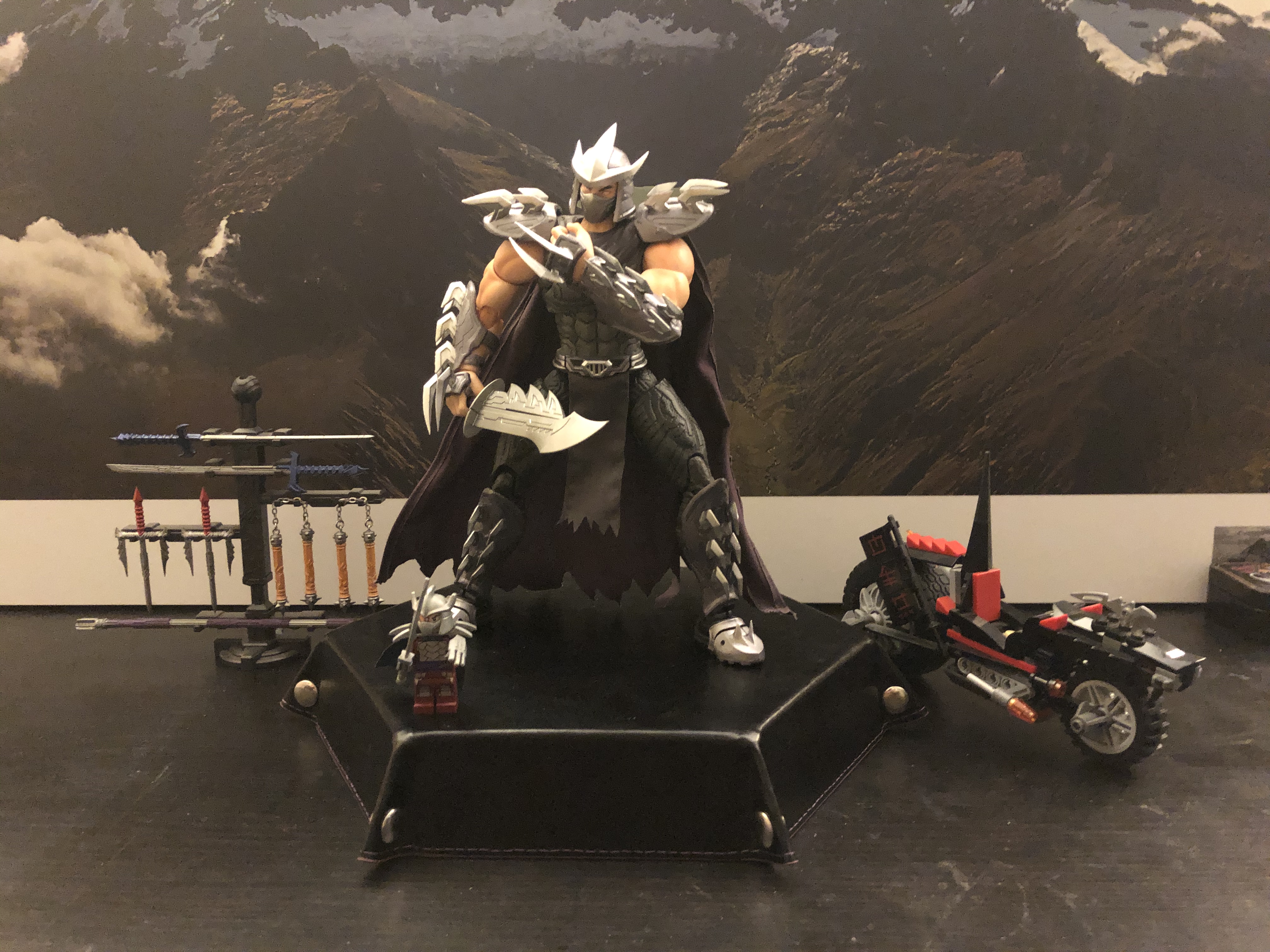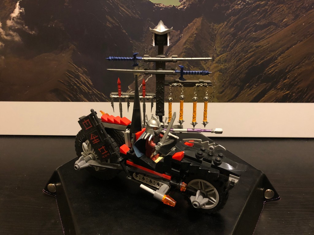 I don’t have as much figures of The Shredder as other toys, but this third-party action figure (details at the end) is much akin to the actual character and does better justice to the character than most official offerings I’ve seen. This particular figure should not be considered ever for a kids’ toy, though. Too many sharp edges, some of which are made of diecast metal and are sharp enough to cut. That helmet is not plastic – it’s metal. So are the blades in his feet. The rest are indeed soft plastic, but they’re still pointy. Don’t hand this over to a child, please. You’re much safer with the LEGO version, also in these pictures, sold with a bitchin’ ninja bike.