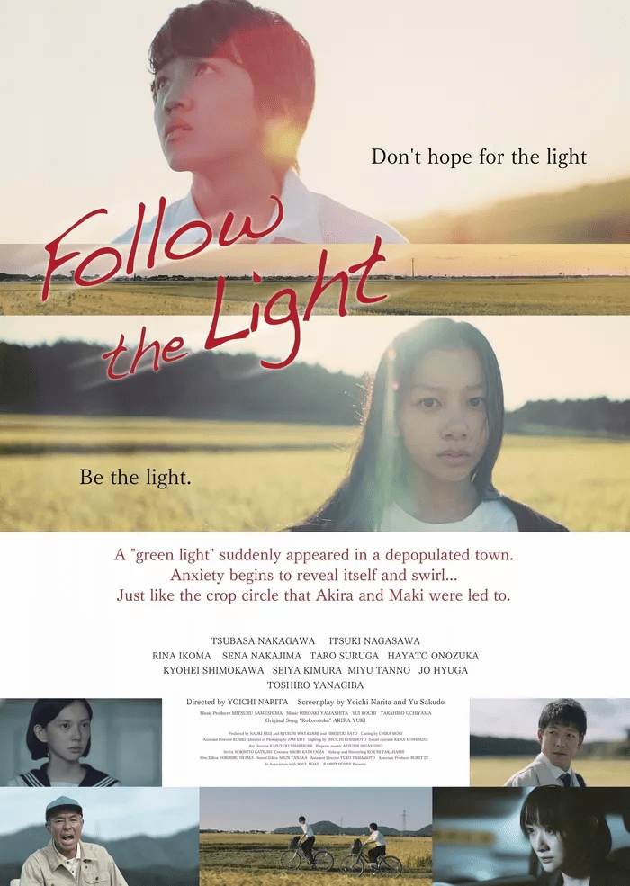 Follow The Light (2020) is directed by Yoishi Narita. Akira (Tsubasa Nakagawa) has just moved to the country and has very little interest in making friends. Eventually he meets Maki (Itsuki Nagasawa) who is alienated from everyone due to her eccentric behaviour. He meets her just after seeing an eerie green light and finds her in a crop circle that has just appeared. That might be the main plot, but the film basically is a very slow and melancholic look at a school about to close, a town where everyone is leaving and everyone that is still there is dealing with abandonment at some degree.