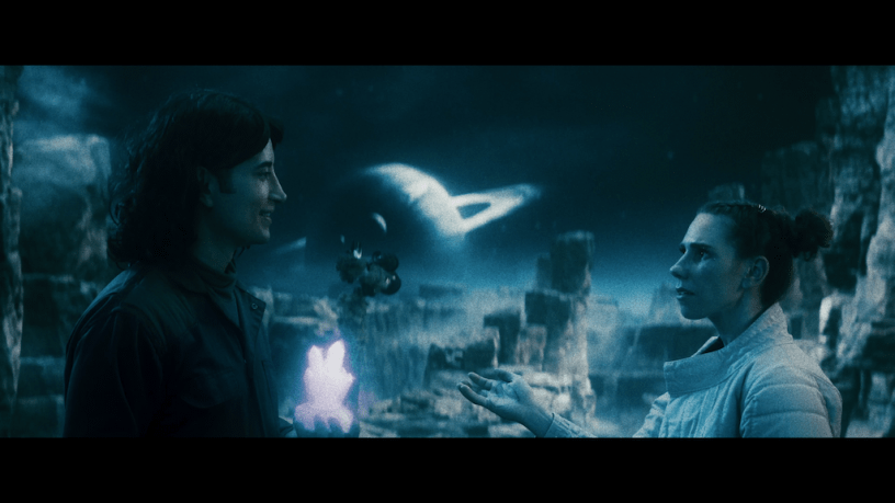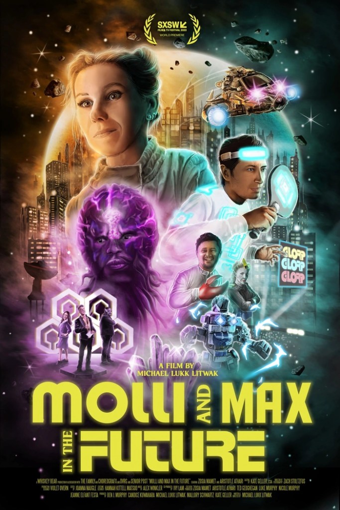 Molli and Max in the Future (2023) is written and directed by Michael Lukk Litwak. Molli (Zosia Mamet) is careening through space trying to find a magic crystal when she runs (literally) into Max (Aristotle Athari). The chance encounter is the usual adorable banter that you can tell will turn them into fast friends, but somehow they don’t quite match. Now, so far it’s a romantic comedy until you slowly but surely start to build the world around them. It’s a world of space cults, gods of all shapes and sizes, robot fighting and ruling the universe.